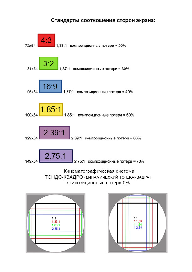 Есть теоретическое обоснование возникновения соотношений сторон в изобразительном искусстве как подсказка художникам видами различной формы из открытых окон и дверей, что вполне убедительно. В связи с этим позволим себе сделать предположение, что первая кинокамера с поддержкой динамического квадрата (Тондо-Квадро) должна быть создана в Японии, в традиционной архитектуре которой используются раздвижные стены, дающие возможность оформлять из интерьера вид прилегающего природного ландшафта в формате с любым соотношением сторон. Очень часто встречаются и круглые окна. Традиционное японское жилище представляет собой своеобразный прототип кинокамеры с форматом динамического квадрата, точнее ТОНДО-КВАДРО.P.S. То́ндо (итал. tondo — круглый, от лат. tondere — округлять, обрезать, обтёсывать) — станковое живописное произведение круглой формы, круглый формат, композиция в круге, изображение, вписанное в круг. В изобразительном искусстве используют различные форматы. Круглый формат идеально выражает статичность, центричность, а в философском смысле — идеальность, гармонию мира. На этих качествах основываются композиции классицизма. Круглый формат дает возможность художнику обыграть пластическое движение линий по окружности, певучесть, музыкальность контуров, зрительно рифмующихся с форматом картины.