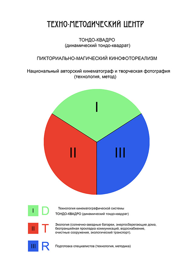 В формате динамического ТОНДО-КВАДРО каждый этнос представит всему миру уникальность и неповторимость своей национальной культуры, которая будет художественно осмысленна представителем новой творческой специальности (кинофотохудожником) в уникальном и глубоко обоснованном для этой задачи формате и реализована на материальной базе Этнического киногородка в пространстве национального ландшафта.